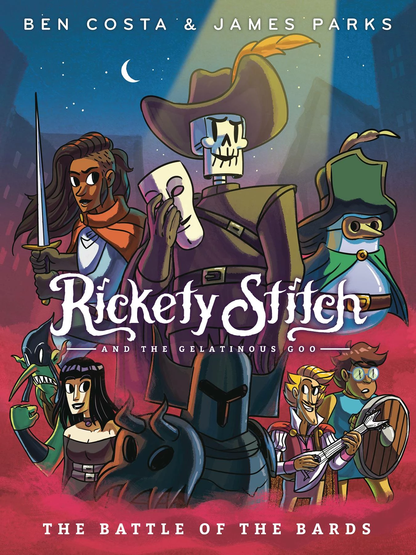 Rickety Stitch is a walking, talking, singing skeleton, the only animated skeleton in the dungeon who seems to have retained his soul. He has no idea who he used to be when he was covered in a living, breathing sack of meat and skin. His only clue to his former identity is a song he hears snippets of in his dreams, an epic bard’s tale that could also explain the old fog covering the comical fantasy land of Eem… Oh, and his sidekick and only friend is a cube of sentient goo. In this race-to-the-finish final volume, Rickety faces all manner of new creatures on his ultimate quest to uncover the secret of Epoli and learn his true origins. Available in softcover and hardcover editions.